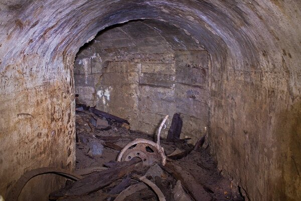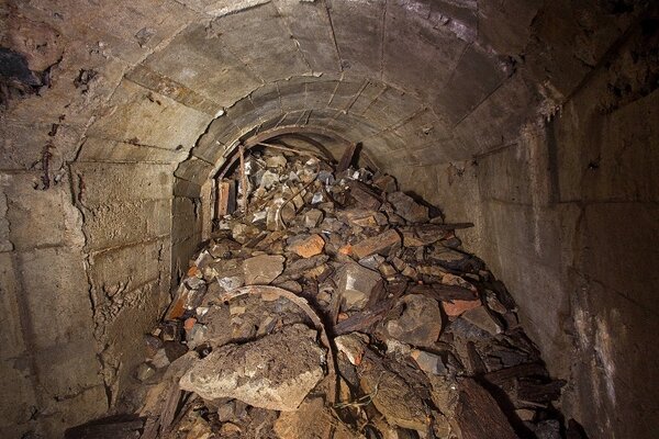 За ним виден заваленный вход, плавно уходящий влево. Когда-то здесь была наклонная выработка, выходившая прямо к одному из цехов на поверхности. Но при последующей застройке территории этот вход был уничтожен.