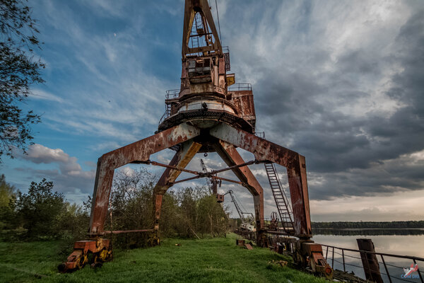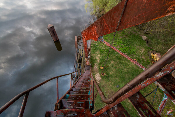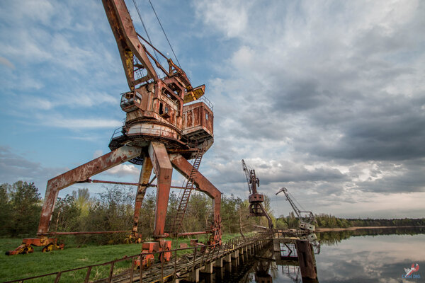 И вот они — старые советские перегрузочные краны грузового порта «Припять». Их здесь несколько. Стрелы замерли в одном положении навсегда. До аварии на ЧАЭС эти гиганты, как и в любом порту, использовались для перемещения штучных грузов с помощью автоматических захватов или грейферов. Краны полноповоротные: стрела, установленная на портале, может вращаться на 360 градусов благодаря опорно-поворотному устройству. Сам портал перемещается по рельсам. Грузоподъёмность каждого — около 80 тонн.