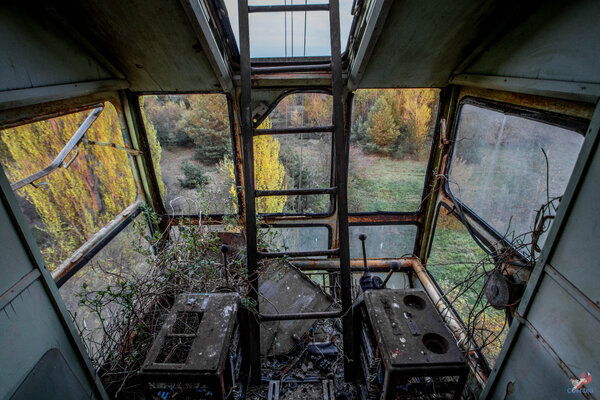 Напоследок — фотография из кабины крановщика. Даже здесь природа взяла своё, оплетая оборудование растительностью.
