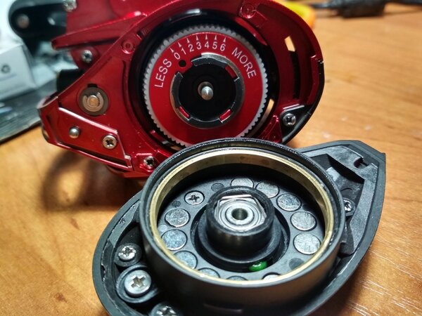 Покрутив катушку в руках и немного поэкспериментировав, я обнаружил, что магнитные тормоза работают просто отлично. Например, при максимальном количестве задействованных магнитов (а их здесь целых 10) и отпущенном фрикционе свободное вращение шпули останавливается примерно через 3 секунды. Если же магниты отключить совсем, то вращение продолжается уже около 8 секунд. Впечатляющий результат!