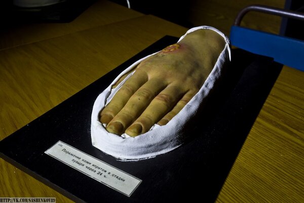 На стендах были представлены наглядные пособия, например, демонстрирующие примеры заражения кожи радиоактивными веществами.