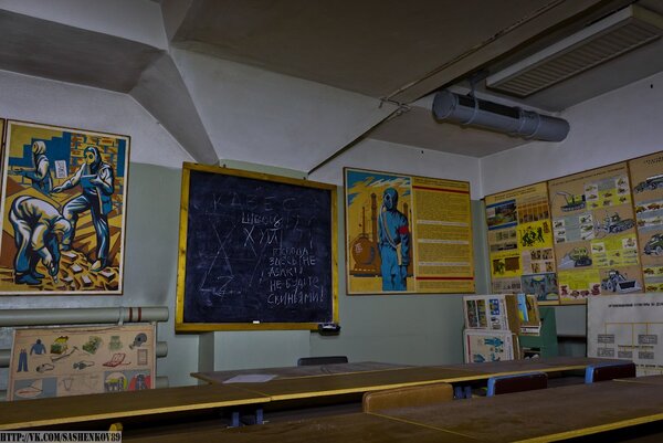 Также мы нашли один из учебных классов, где, видимо, проводились занятия по гражданской обороне для работников завода.