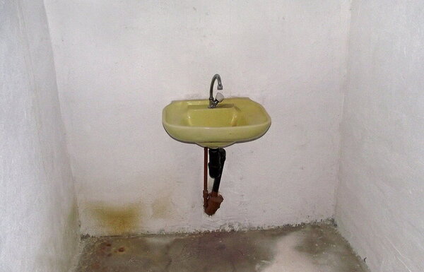 Баки с питьевой водой установлены прямо между входами в мужской и женский туалеты. На стене хорошо видны гидранты для подключения пожарных рукавов.