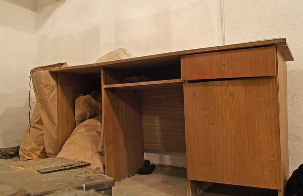 У рабочего стола пункта управления сложены мешки и ящик. В них хранятся типовые для таких убежищ предметы: средства индивидуальной защиты, рация, учебная литература по Гражданской Обороне и прочее.