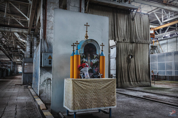 За одной из колонн кто-то обустроил небольшой православный уголок — тихий след чьей-то веры среди запустения.
