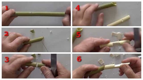 Теперь формируем мундштук. Один конец нашей заготовки срезаем под углом — это будет то самое место, куда мы будем дуть.