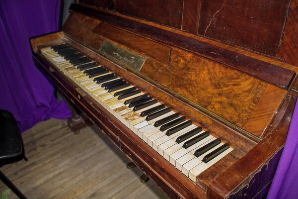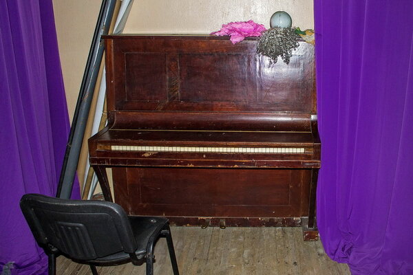 За кулисами, как и полагается в таких заведениях, стоит пианино — верный спутник любого Дома Культуры.