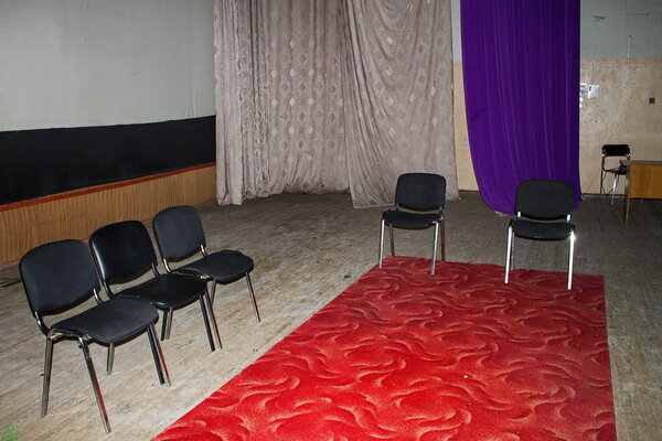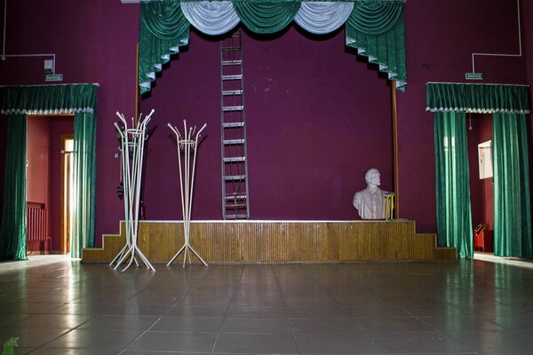 В углу сцены стоит бюст Ленина, но кто-то успел отломить ему нос — молчаливый свидетель вандализма в этом тихом месте.