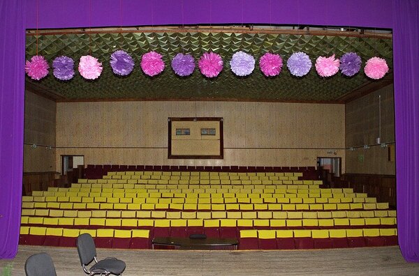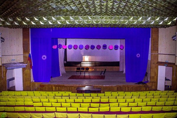 Вид на зал со сцены впечатляет: ряды кресел, занавес, всё готово к началу сеанса или концерта.