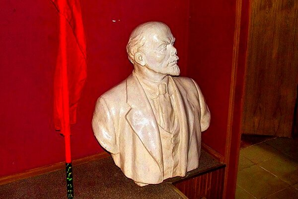 В углу сцены одиноко стоит бюст Ленина — непременный атрибут эпохи. Правда, время или чья-то рука уже лишили его носа.