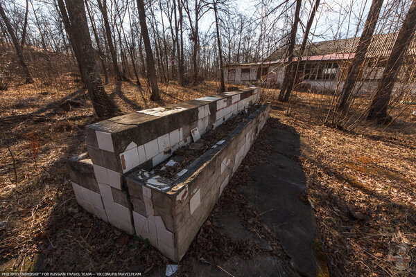 Уличный умывальник. Кто-то предприимчивый умудрился унести краны и трубы. Печально, когда людям приходится зарабатывать подобным вредительством. Хотя это и кажется мелочью, но после нескольких лет таких «набегов» восстановить пионерский лагерь будет уже невозможно.