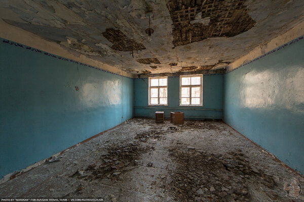А вот так выглядели жилые комнаты. Время неумолимо делало своё дело: потолок медленно, но верно осыпался на пол. Скоро он может обрушиться окончательно, и здание превратится в настоящие руины.