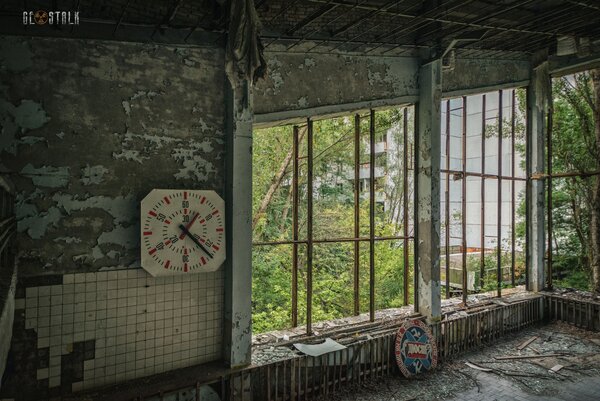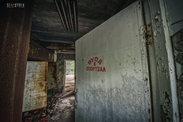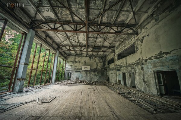 Огромные панорамные окна давно лишились стёкол, пол кое-где просел и обвалился. Но даже в этом состоянии пустой, залитый тусклым светом зал с баскетбольным кольцом вдалеке рождает странное, почти инстинктивное желание — найти мяч и попробовать забросить его с самой дальней точки. Жаль, под рукой его не оказалось.