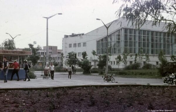 Сейчас, в тёплое время года, здание бассейна снаружи почти не разглядеть — его плотно обступают заросли деревьев и кустарников. Поэтому логично показать, как оно выглядело, когда Припять ещё была полна жизни.