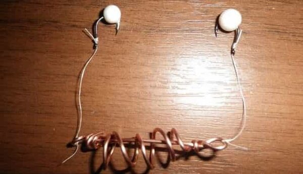 6. Далее отрезаем плетёнку пополам, берём крючки и делаем два поводка, привязывая леску к крючкам. Свободные концы плетёнки крепим к петелькам нашей самодельной кормушки.