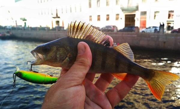 Речь идет о высоких набережных в исторической части города. Я уже упоминал, что в местных реках — Мойке, Фонтанке и многочисленных каналах — водится вполне солидный окунь, часто попадаются экземпляры по 250-300 граммов, а иногда и крупнее. При моей обычной рывковой проводке этот воблерок слишком активно стремится к поверхности, а это мне совершенно не подходит. Самые перспективные и увесистые окуни, как правило, держатся у дна, в глубине...