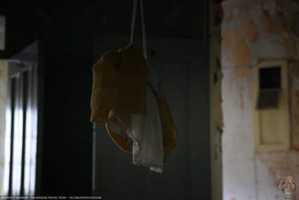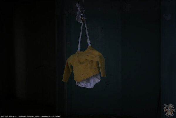 Первое, что бросилось в глаза, — опрокинутый шкаф и детская одежда, подвешенная к потолку. Зрелище, признаюсь, навевает лёгкую дрожь.