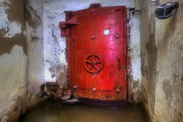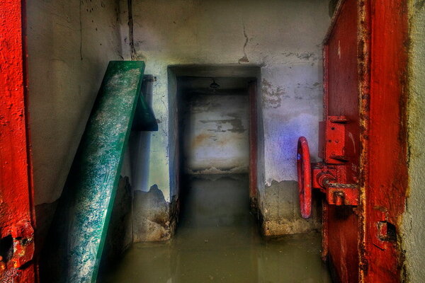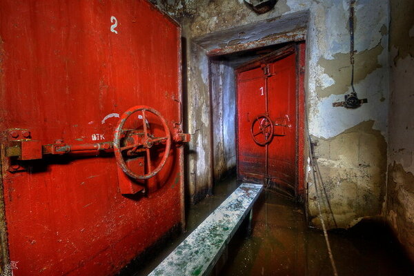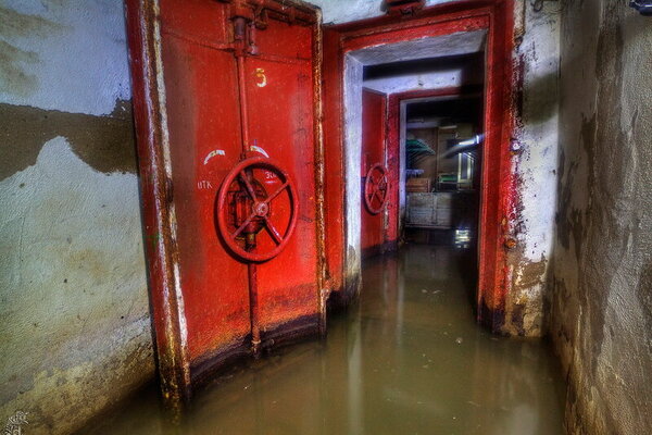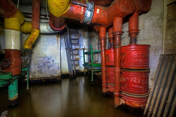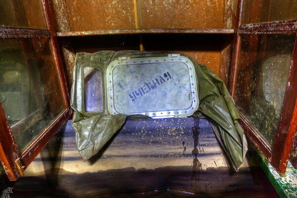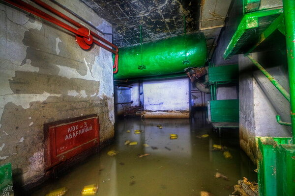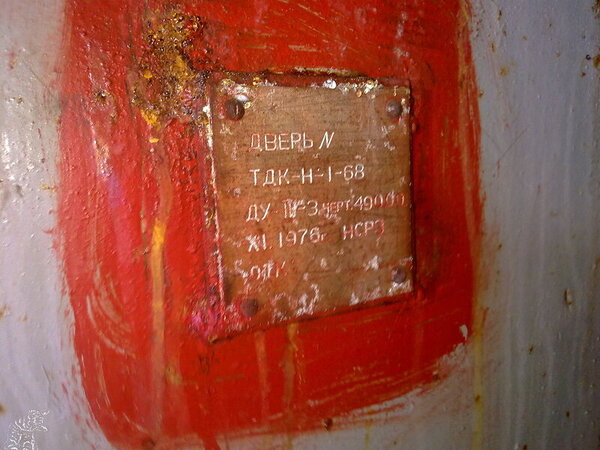 Вход в подтопленный тамбур-шлюз главного входа когда-то защищала характерная «пузатая» защитно-герметическая дверь со шпильками.