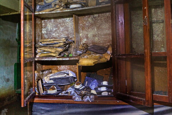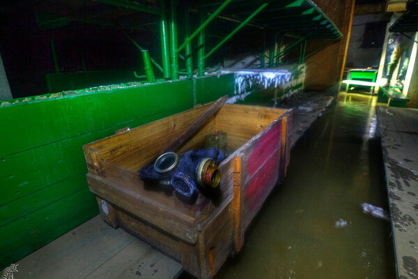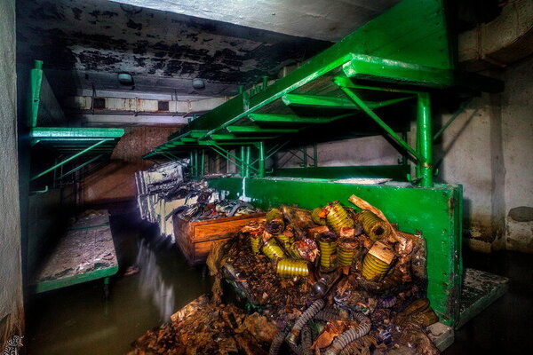 На них в беспорядке разбросаны прогнившие противогазы с фильтрами и прочий хлам, относящийся к системе гражданской обороны.