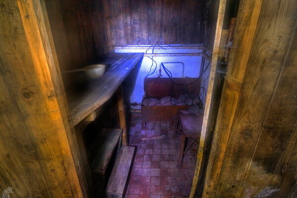 И, наконец, тамбур-шлюз запасного выхода. Вода во время одного из подъёмов принесла сюда и оставила деревянную лавочку.