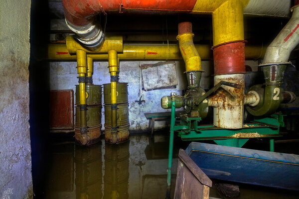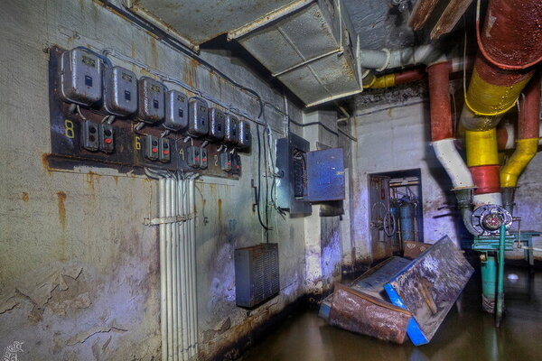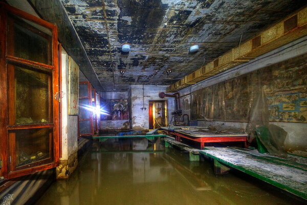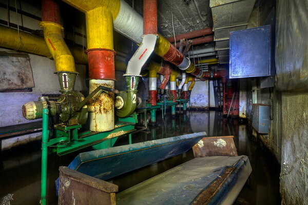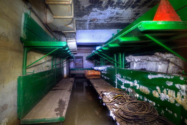 За ними вглубь уходят два лестничных марша, когда-то ярко окрашенных, а ныне покрытых плесенью и гнилью. Прямо на ступенях валяется сгнивший насос — немой свидетель безуспешных попыток откачать воду после выхода из строя штатной системы водоотлива (ЗУМПФ). Видимо, все усилия были тщетны: повреждённая гидроизоляция вновь и вновь пропускала влагу внутрь.