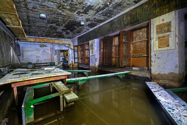 Перед нами отдельно стоящее убежище штаба Гражданской Обороны Находкинского Судоремонтного завода, возведённое во второй половине 1970-х годов. Судьба этого объекта печальна — его регулярно затапливало грунтовыми водами, иногда уровень поднимался почти до самого потолка, что в итоге привело к полному запустению и разрушению.