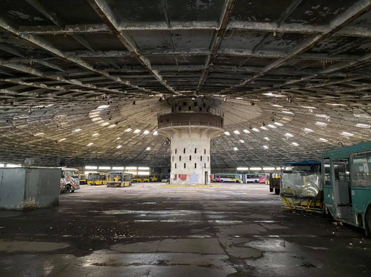 Вот такая необычная картина — гигантская «тарелка», набитая остатками былого автобусного хозяйства.