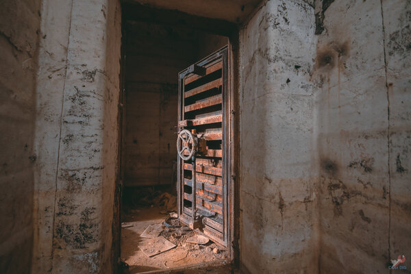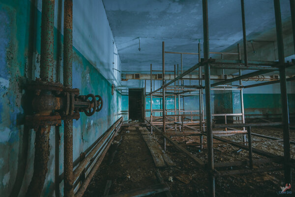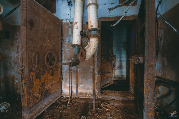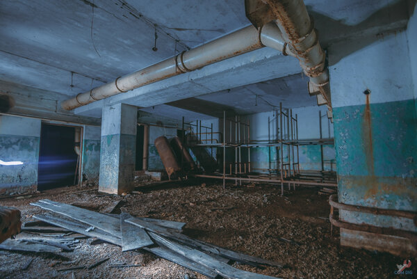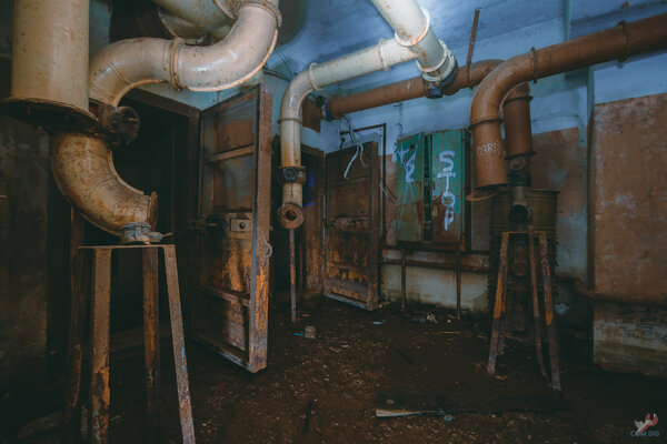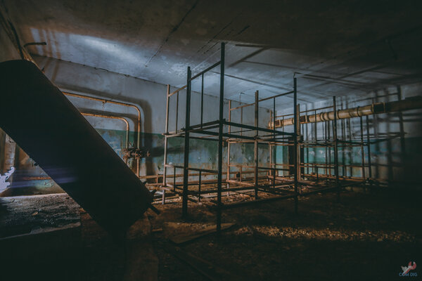 Из вентшахты сразу попадаю в помещение с воздушными фильтрами. Все жизненно важные элементы фильтровентиляционной системы отсутствуют. Сложно сказать, как давно это бомбоубежище заброшено. Но ясно одно: до нас здесь побывало много людей. Приступаем к фотосъёмке.