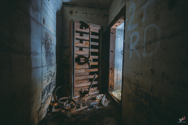 Перед тем как лезть в вентиляцию, мы тщательно проверили наклонные входы. Неудивительно, но они оказались заблокированными и заваренными. Открываем металлическую створку вентиляционной шахты и видим, что лестничных скоб нет. Глубина примерно 4–5 метров. Напарник спускается, упираясь в стенки, а я жду его сигнала. Проходит несколько минут, и слышу шарканье обуви и возглас: «Блин! Здесь всё очень прогнило!» Но даже ржавчина и гниль могут быть живописными и подходить для фотографий. Скидываю рюкзаки вниз товарищу и начинаю спускаться сам.