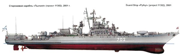 Корабли проекта 11352, к которому относился «Пылкий», — это крупные сторожевики. Их длина составляла 123 метра, а водоизмещение — 3200 тонн.