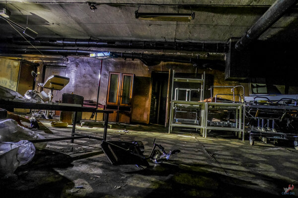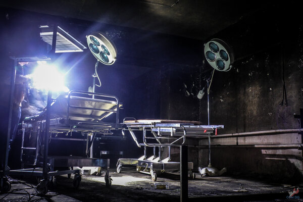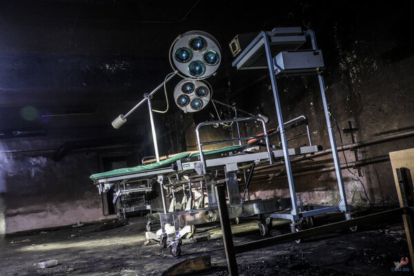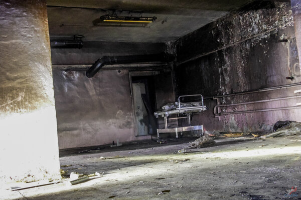 Первое, что встречает посетителя, — облупившиеся стены, кое-где видны следы пожара. Прямо у входа стоит одинокая каталка, создающая жутковатое впечатление.