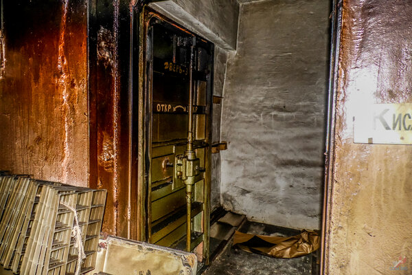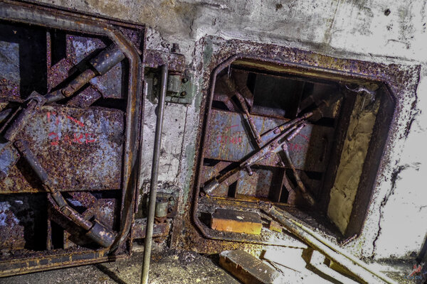 Герметические ставни. Один из них заблокирован и ведёт в оголовок бетонной вентиляционной шахты.