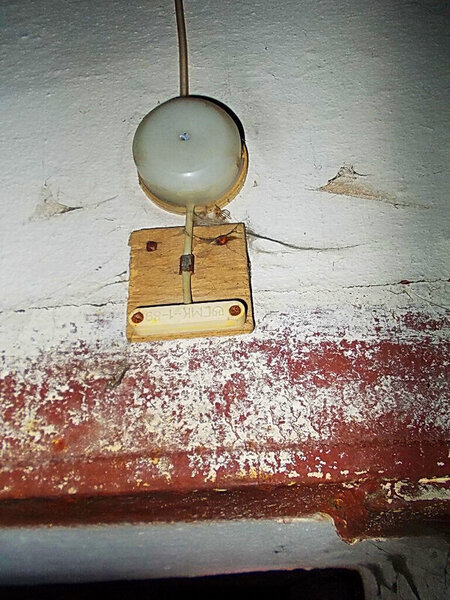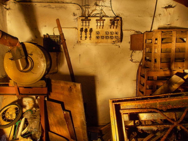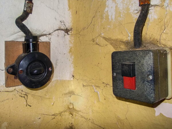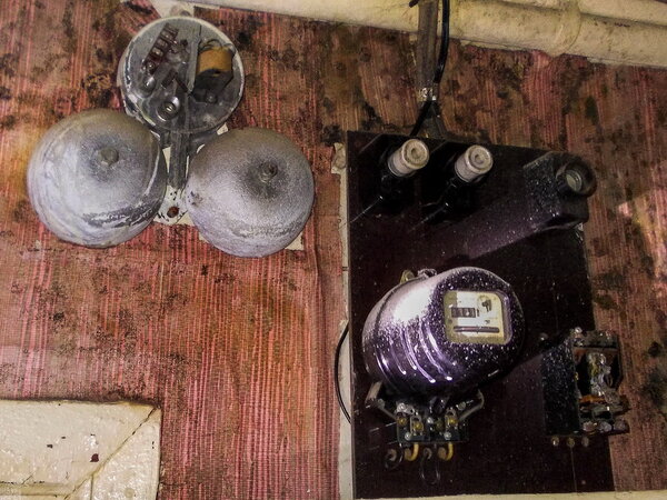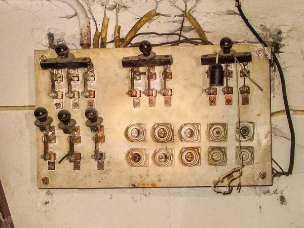 На стене сохранился распределительный щит со старыми рубильниками и патронами для плавких пробок.