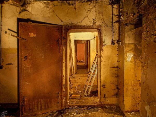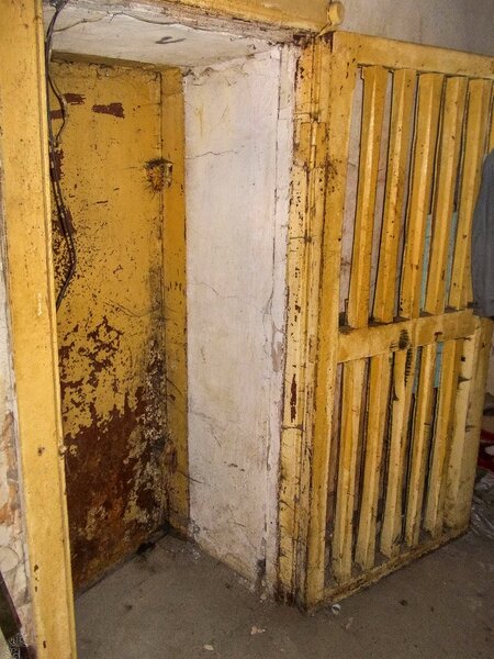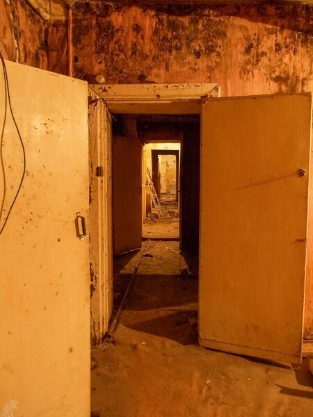 Спуск в убежище начинается прямо с лестничной клетки подъезда. Он ведёт к входному тамбуру, где до сих пор сохранились массивные гермодвери.