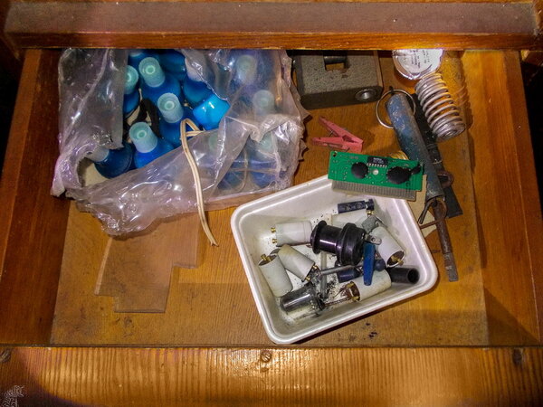 В ящиках стола — запасы канцелярского клея и прочий хлам, а также плата картриджа для игровой приставки "Famicom".