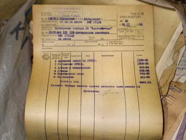 На полу валяются квитанции об оплате аренды каких-то помещений за 1991 год и прочий бумажный хлам.