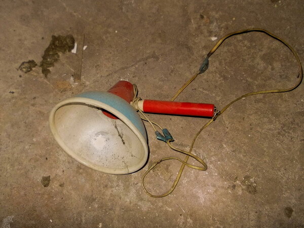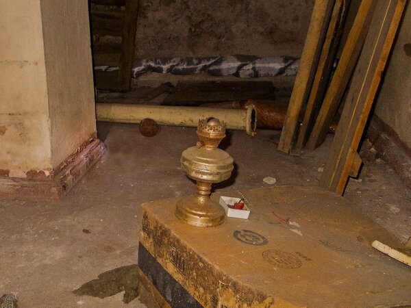 Здесь, среди хлама, стоит керосиновая лампа, у которой не хватает стеклянного колпака.