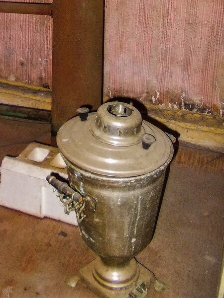 Среди разбросанного мусора мне попался, судя по всему, старый керосиновый обогреватель. Для масштаба — рядом лежит советская стеклянная бутылка из-под молока, а на заднем плане видны покрышки.
