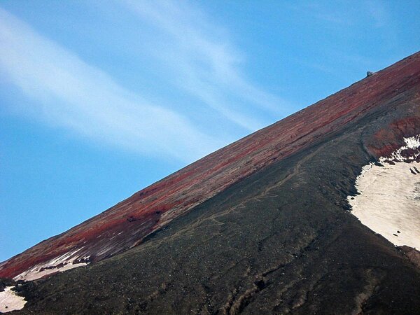 На склонах Авачинского вулкана снег не тает полностью даже в разгар августа.