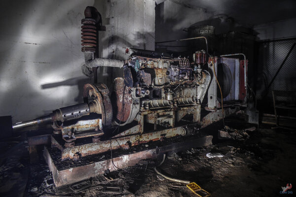 Мы подошли к парадному входу и начали спускаться по ступеням вниз. Под землёй было ощутимо прохладнее, чем на жаркой улице. Пришлось подождать несколько минут, чтобы объективы наших фотоаппаратов адаптировались к перепаду температуры, после чего мы быстро приступили к осмотру. Начали мы с дизельной электростанции, которая была отделена от основного зала двумя массивными герметичными дверями.