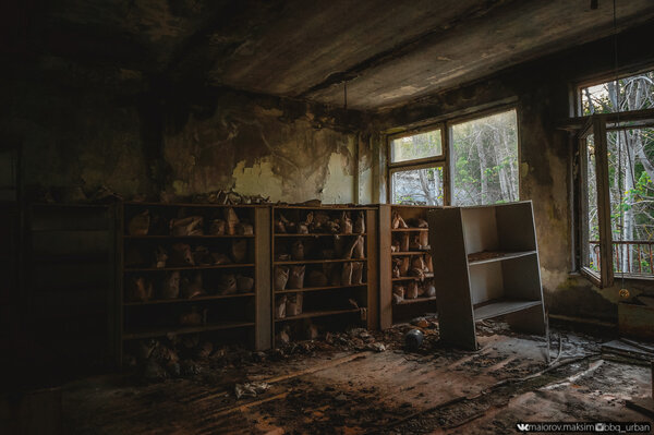 Мешки с радиоактивной землёй медленно разрушаются: они сползают с полок, падают на пол, рассыпаясь и превращаясь в токсичную пыль, которая оседает на всём вокруг. Зрелище одновременно жуткое и завораживающее — символ того, как время и забвение расправляются даже с самыми страшными свидетельствами.