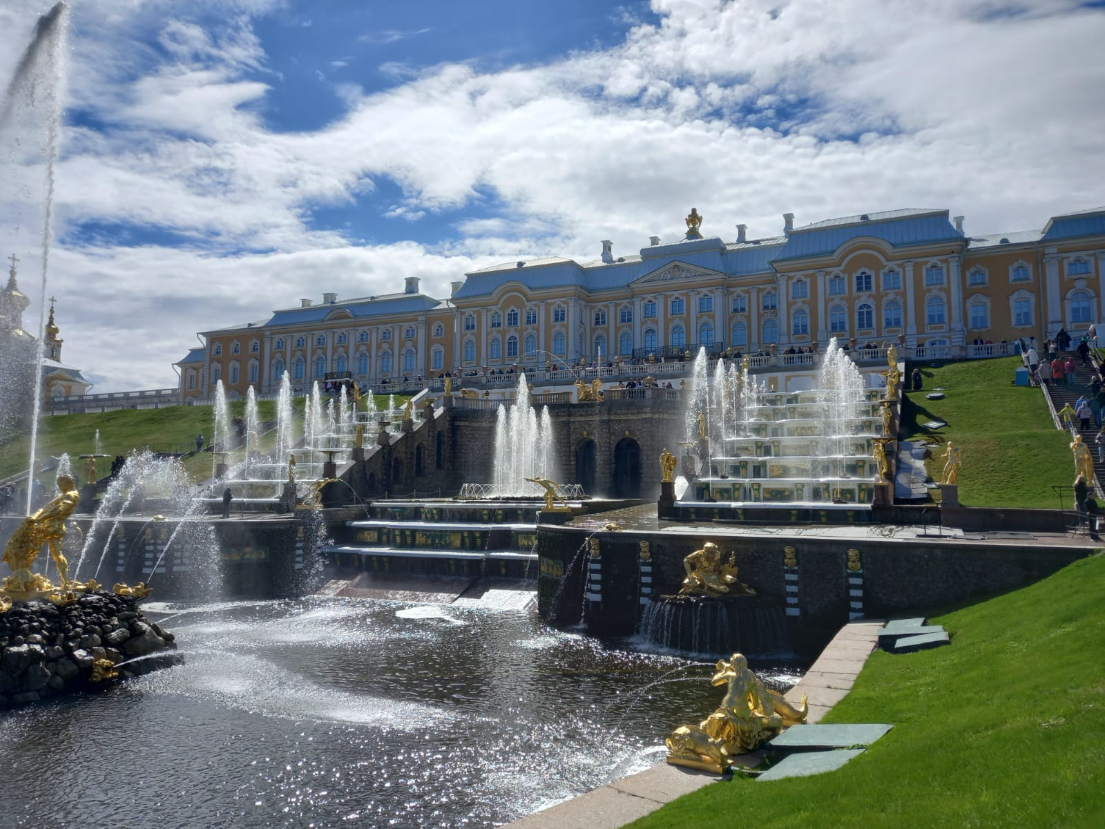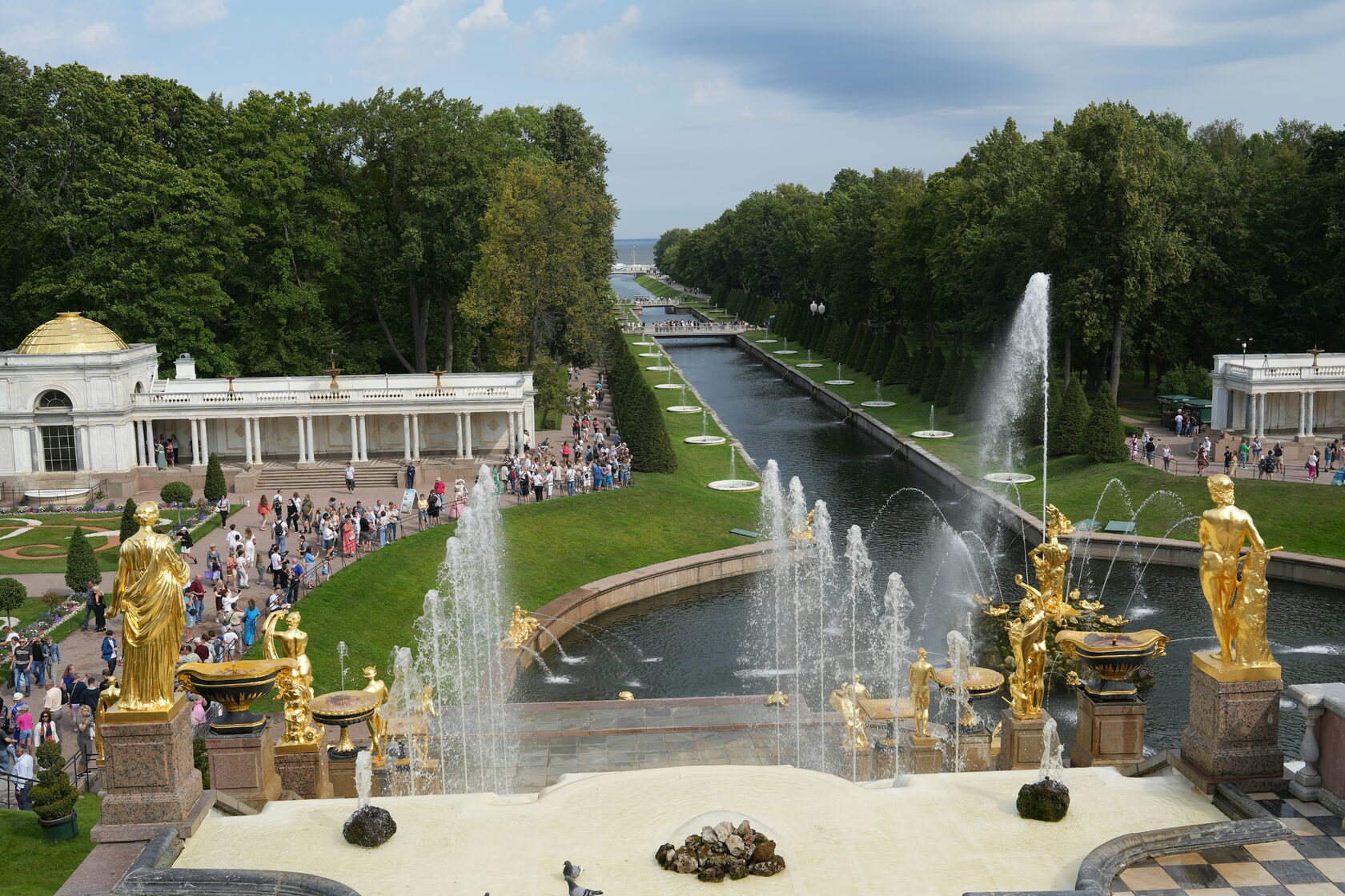 Мурашки бегут по коже! По обе стороны от Большого каскада можно встретить людей, одетых в костюмы вельмож прошлых эпох. Возникает полное ощущение, что вы перенеслись на триста лет назад. Более того, вы и сами можете арендовать наряд придворного и устроить потрясающую фотосессию на фоне этих умопомрачительных декораций.Если вы добираетесь по суше, то на территорию заповедника можно попасть через Верхний парк. Сейчас он на реставрации, поэтому временный вход организован сбоку от Большого дворца. Стоит вам войти — и перед вами откроется захватывающая дух панорама! Золотисто-белый дворец, бывшая летняя резиденция русских императоров. Перед ним — терраса, от которой к морскому каналу спускается величественный, сверкающий на солнце Большой каскад. Это грандиозное сооружение состоит из 64 фонтанов и почти двух сотен позолоченных скульптур.