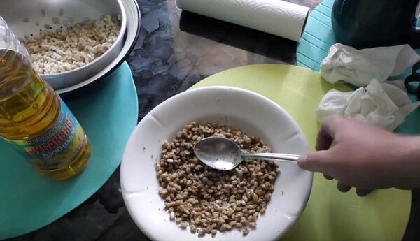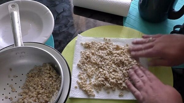 Когда время выйдет, высыпаю перловку на газету или бумажное полотенце. Это нужно, чтобы убрать излишки влаги с поверхности зёрен.