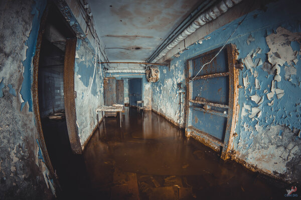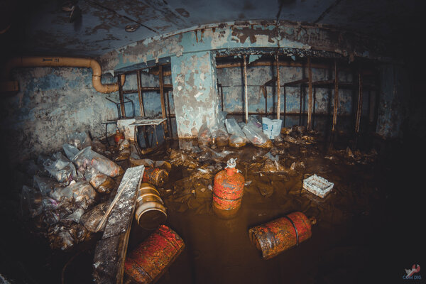 Вот так выглядит парадный вход изнутри. Под слоем воды валяется груда противогазов ГП-5 — немой свидетель прошлой эпохи.