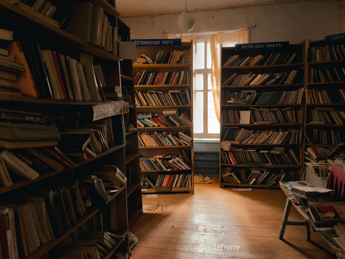 Само помещение библиотеки просторное, но книг осталось не так уж много. Пустые полки и разреженные ряды томов создают ощущение особой, печальной пустоты.