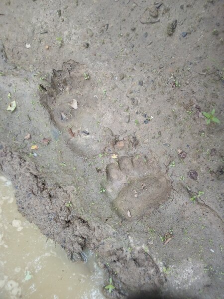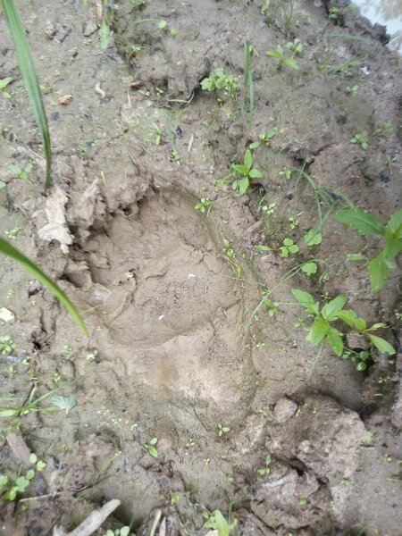На тропе мы обнаружили свежие следы, которые, судя по всему, оставили медведица с медвежонком. Встречаться с лесными хозяевами не входило в наши планы, поэтому мы решили отпугнуть их, выстрелив свето-шумовым патроном «Гром» из ракетницы.