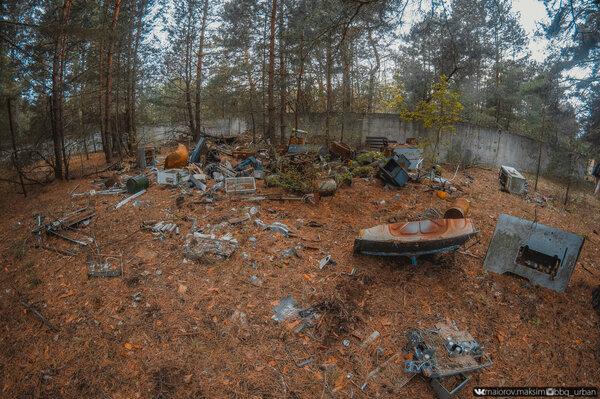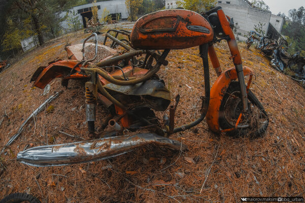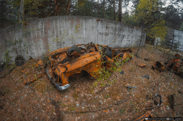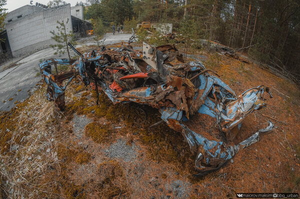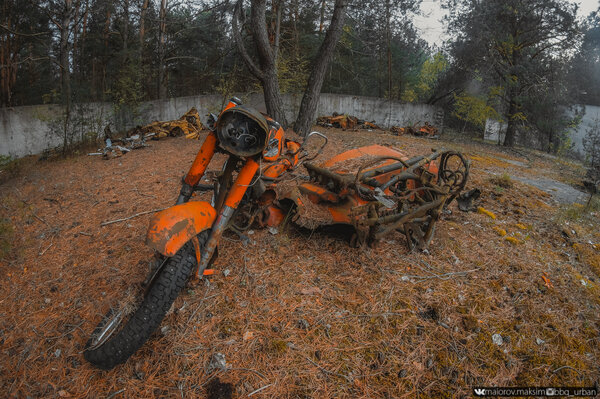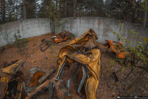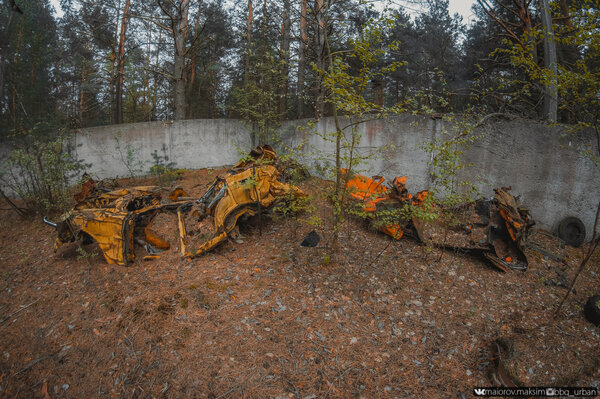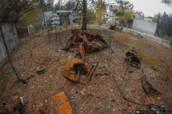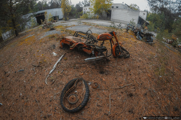 На площадке перед самим магазином сделали своеобразное кладбище автомобилей и мототехники. Тут находится авто и мототранспорт жителей Припяти, а также армейские грузовики.