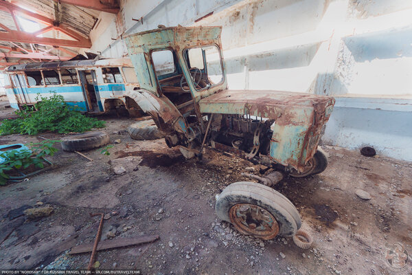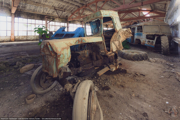 В глубине очередного цеха, за грудой старых металлических шкафов и полок, скрывалась целая стоянка забытой техники, судя по всему, когда-то служившей этому предприятию.