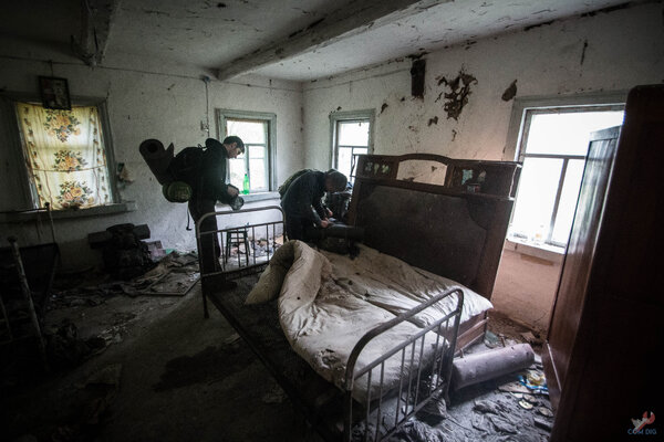 Свернув в село, мы услышали лишь хруст веток под ногами. В полной темноте искали укрытие для ночёвки. Запасы воды таяли, сил почти не оставалось. Нашли дом с целыми окнами и дверью — относительно безопасное убежище. Сдвинули кровати в одну комнату и рухнули спать.