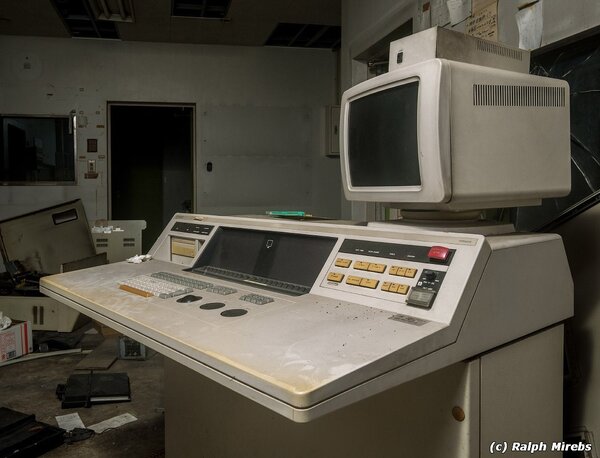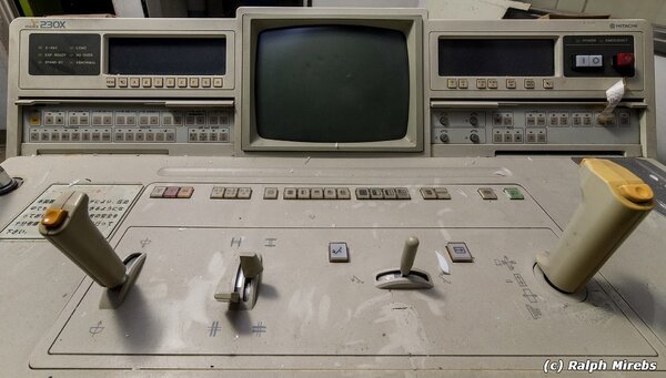 Судя по всему, это пультовая для управления томографом, который мы видели на предыдущих снимках. Именно здесь задавались программы обследования и выводились на мониторы результаты сканирования. Рычаги, скорее всего, использовались для более точного позиционирования пациента относительно аппарата.